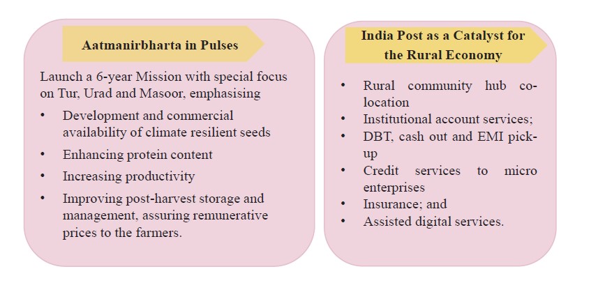 • Rural Prosperity and Resilience’ programme will be launched to resolve the issue of underemployment in agriculture through skilling, investment, technology, and invigorating the rural economy.