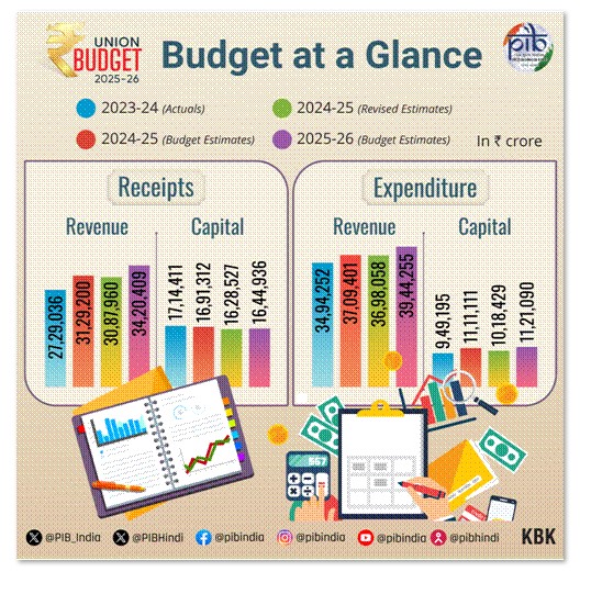 • Receipts: The receipts (other than borrowings) in 2025-26 are estimated to be Rs 34,96,409 crore, which is 11.1% more than the revised estimate of 2024-25.