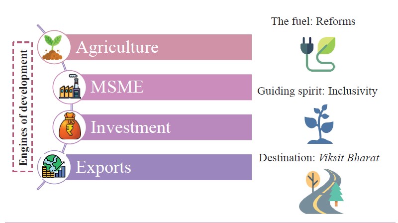 Union Budget highlights that Agriculture, MSME, Investment, and Exports are four engines in the journey to Viksit Bharat.