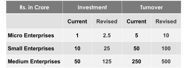 • The investment and turnover limits for classification of all MSMEs enhanced to 2.5 and 2 times.