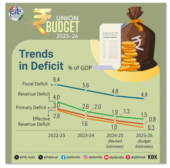 • Fiscal deficit in 2025-26 is targeted at 4.4% of GDP. It is less than the revised estimate of 4.8% of GDP in 2024-25.